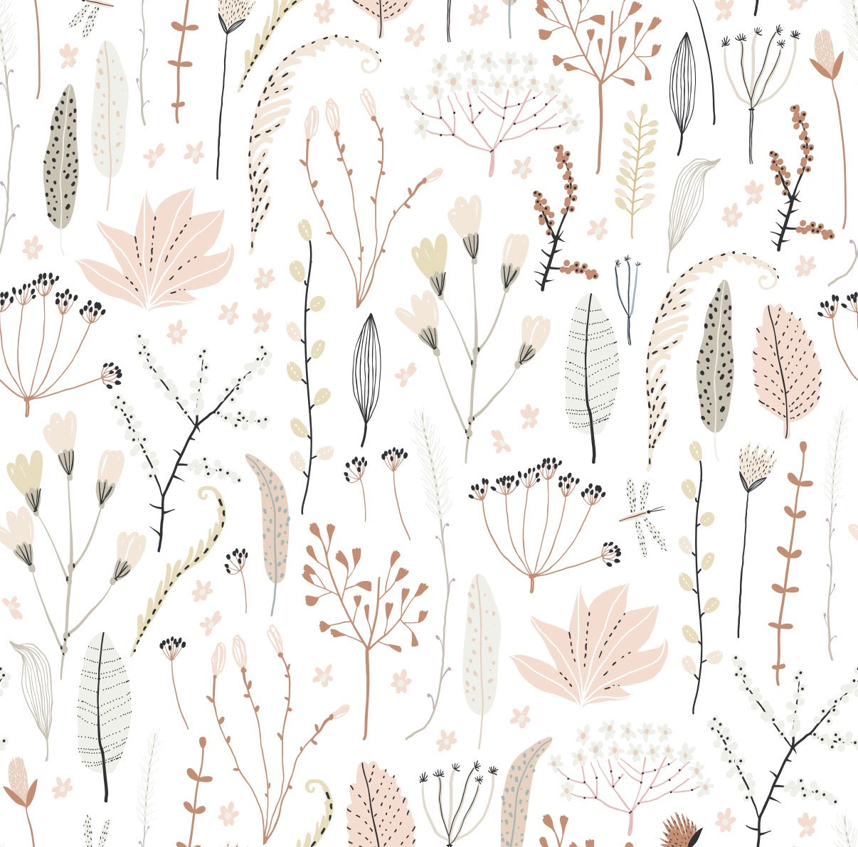 Un diseño suave aporta este papel mural jardín Josefina, delicado y lleno de pequeños detalles que transforman cualquier espacio en un lugar mágico